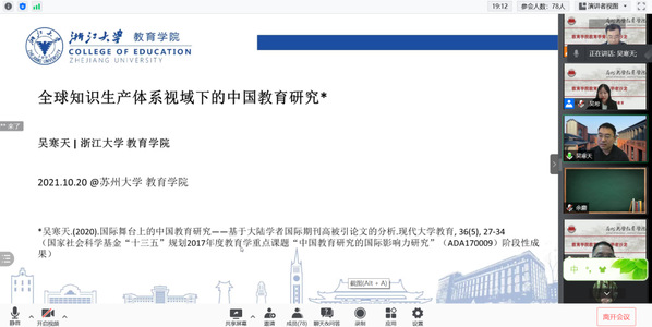 10月20日下午1时30分,我院以线上会议的形式举办了教育学青年学者沙龙,此次沙龙的主题为“全球化视域下的中国教育”。本次沙龙邀请浙江大学教育学院“百人计划”研究员吴寒天博士和华东师范大学职业教育与成人教育研究所郑杰博士主讲。沙龙由我院吴希副教授主持,曹永国教授、唐斌教授、黄启兵教授、余庆副教授、金国副教授、 洪颐博士等参加了此次学术沙龙。我校及厦门大学、华南师范大学、河海大学等全国多所高校师生等100余人参与了此次线上学术交流活动。