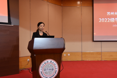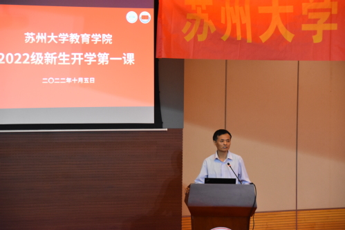 2022年10月5日中午12:30,苏州大学教育学院2022级学生开学典礼暨新生“开学第一课”在苏州大学独墅湖校区炳麟图书馆学术报告厅举行。教育学院院长冯成志,党委书记赵阳,副院长曹永国、吴铁钧、冯文锋,院长助理王一涛、付亦宁,党委委员、心理学系主任周成军,教育技术学系主任秦炜炜,2022级新生班主任薛卫军、朱乐平、赵松、孙梦丹,学生工作办公室主任钱成一,团委书记张旻蕊,团委副书记金利妍,2022级全体学生出席了本次开学典礼,开学典礼由学院党委副书记、副院长朱晨花主持。