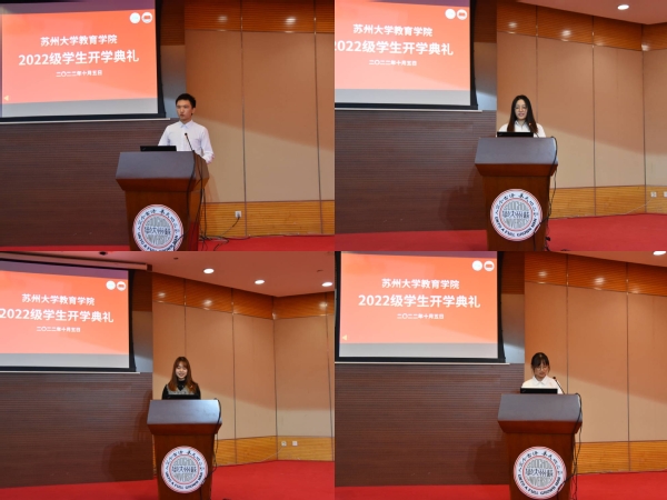 2022级本科生代表、教育技术学(师范)专业张栩豪同学表示身为新时代之青年,应当将个人与国家命运紧密融合,努力成为对国家、对人民、对社会有用的人。2022级研究生代表、教育学专业硕士研究生陈子涵同学引用朱永新教授的话:“争当做一名有学问、会批判的行动家”,表达了勇于担起历史和时代重任的决心。2020级本科生代表、院学生会执行主席施泽宇同学分享了在学院学习生活的经历,鼓励新生要立志高远、脚踏实地,担起青年学生的重担。2021级研究生代表、院研究生会执行主席胡星星同学分享了读研期间的经验和感悟,希望新生珍惜宝贵的学习时光,潜心学术,秉承科学的研究态度,要有家国大爱,把远大理想和现实联系在一起,并祝愿大家在独墅湖畔书写精彩的人生故事。