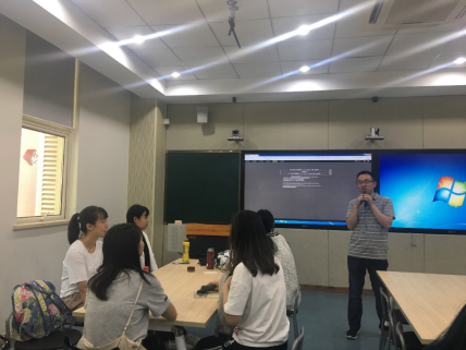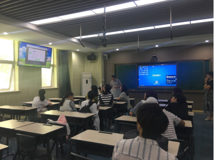 首先,信息处薛锋老师介绍了学校“智慧教室”的基本配置及教学应用情况。目前学校“未来教室”为简化版,拥有两块显示屏,每位学生都配有平板电脑,可以进行小组互动学习。翰林小学老师积极利用“未来教室”开展教学改革。
