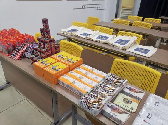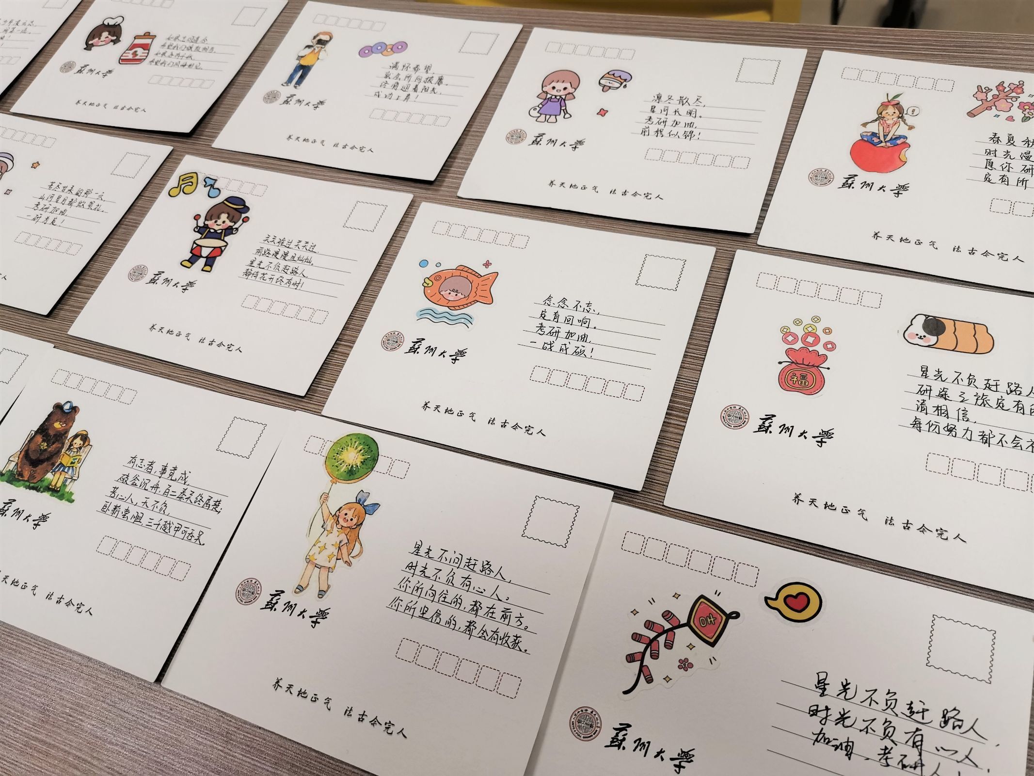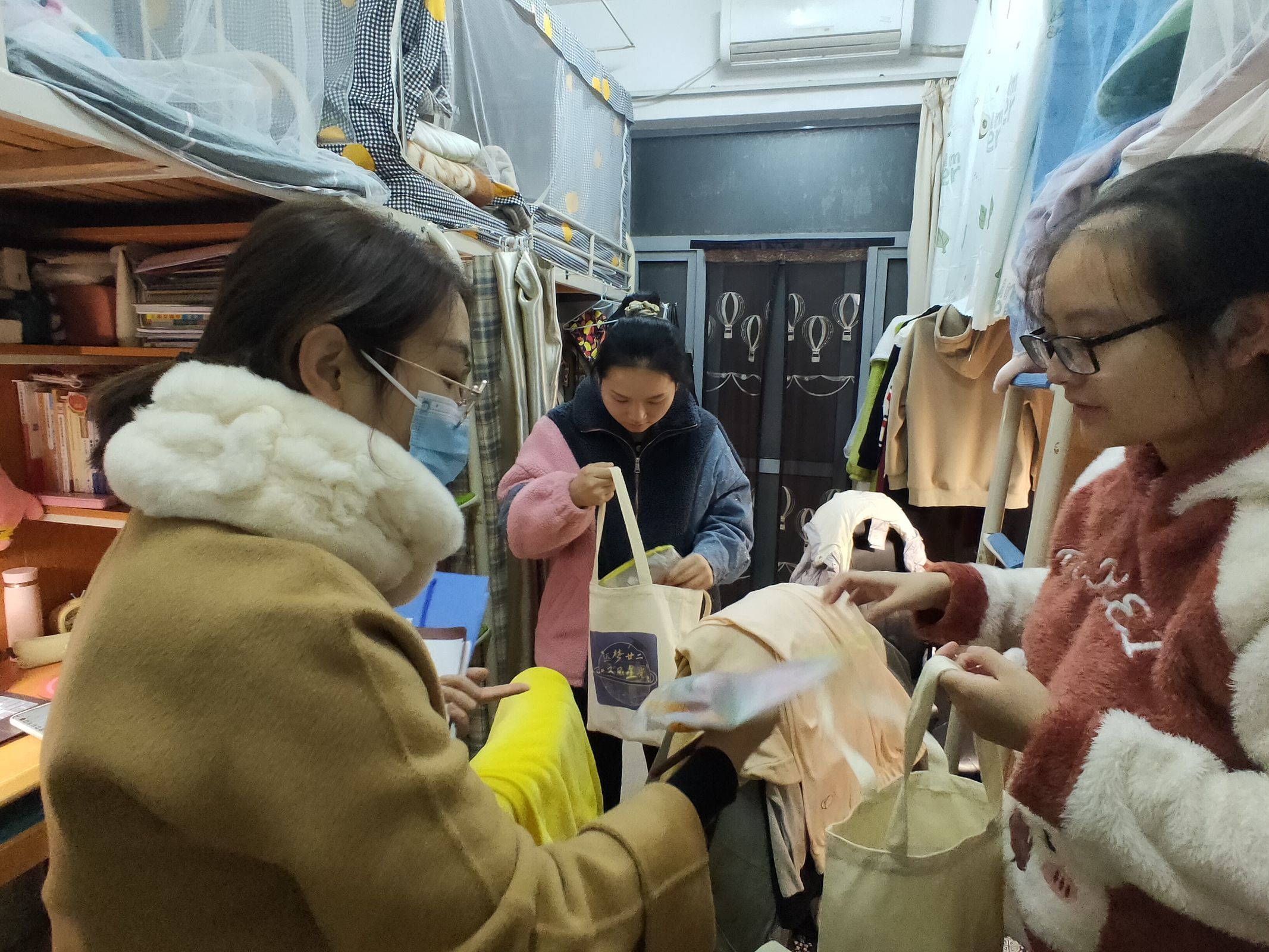 12月5日同学们在1005-5536集合,共同设计“暖心明信片”的文案和排版,并将前期采购的物资进行分装,组成一个个“考研暖心包”。每一个“暖心包”中既有“暖心明信片”、考试必备文具,也有巧克力、咖啡条、面包、口罩等物资,满含祝福又方便实用。